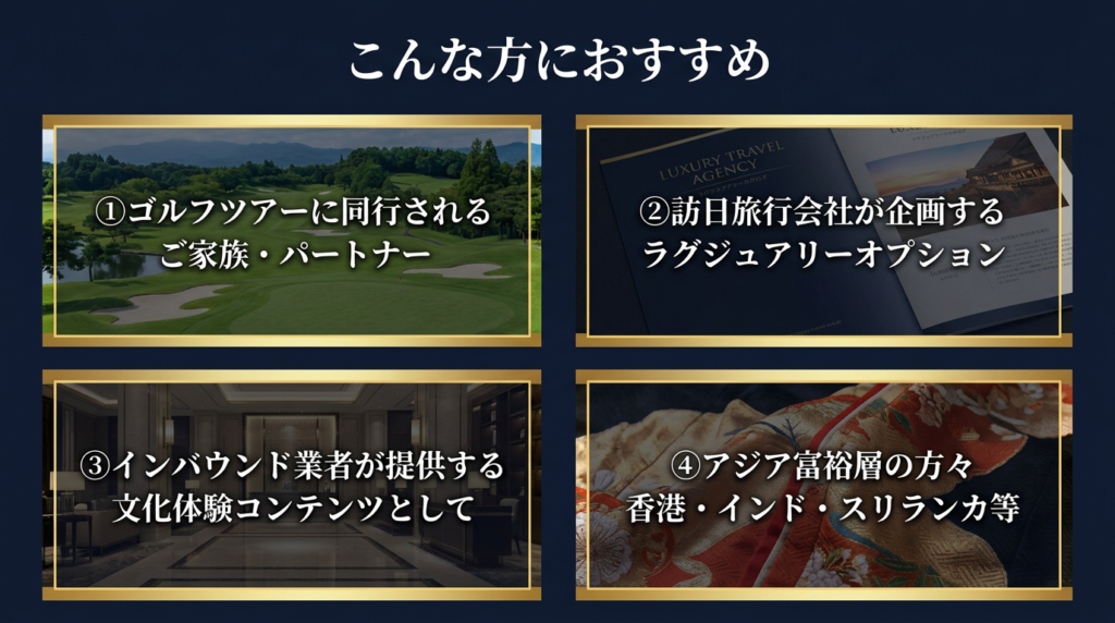 • 📍 訪日旅行会社 → ラグジュアリーツアーの文化体験コンテンツとして組み込み